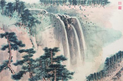 谢稚柳在这套颇为自得的山水册中,以捕捉到的十二处丹霞景致为原型,刻画出丹霞盛景。有横亘的巨石、壁立的山峰、飞泻的瀑布、虬曲的古松、摇曳的轻舟、潋滟的碧波、迂回的山湾、朦胧的云雾,也有水村山郭、平畴绿野,更有白云深处人家。就技法与意境而言,有青绿山水、浅绛设色,也有水墨写意;有平远、高远,也有深远。在其精心酝酿与独具匠心的造型中,我们可借此领略丹霞之美。谢稚柳的山水画,多得江山之助,此画即可见其一斑。