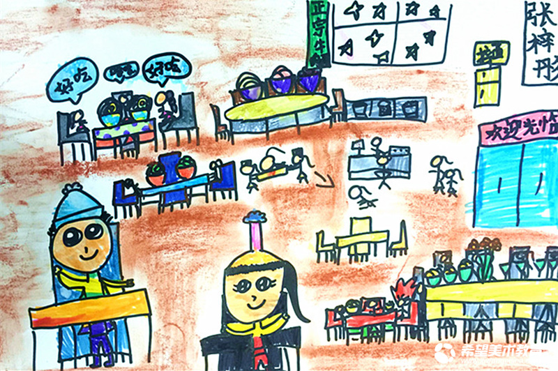 张梓彤 7岁 《兰州拉面》 指导老师:刘华 作品点评:通过回忆生活中吃面条的场景创作的这样一幅具有生活气息的作品,彤彤这个作品整体表现的非常棒!而且每一个线条,每一个场景都看得出孩子的思维特别灵活,画面中的厨师,吃面条的人,在等待的人,小朋友这样的不同的人物角色都表现的很不错!看得出是一个很有心得姑娘!