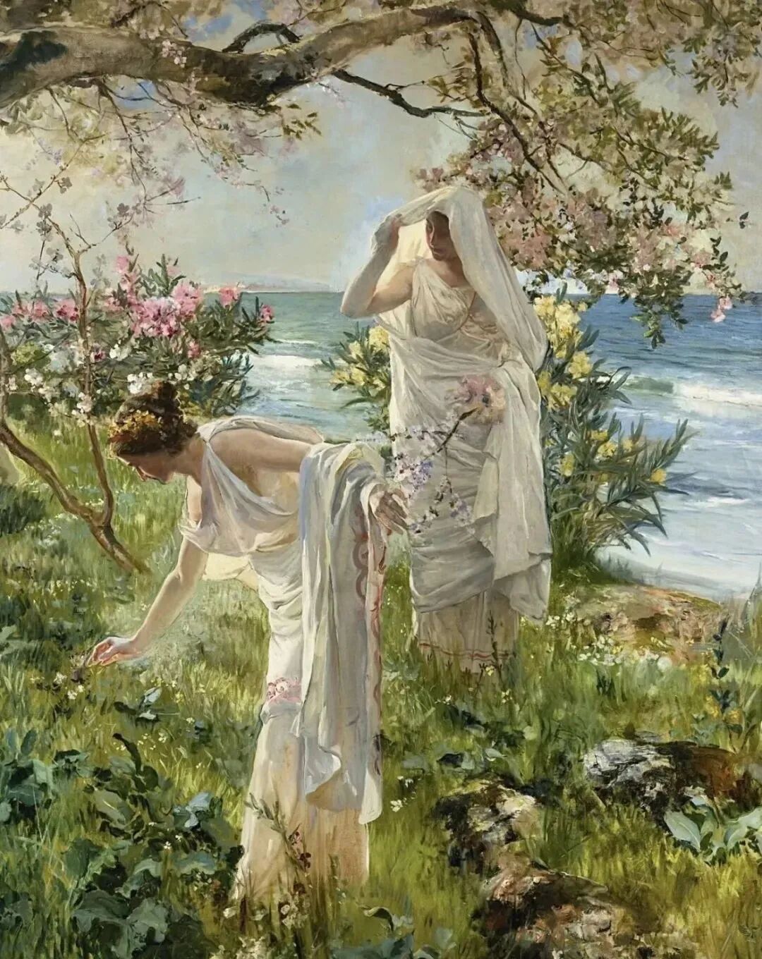 艺术与丑陋或悲伤无关。光是它所接触的一切的生命,所以绘画中的光越多,生命就越多,真理越多,美就越多。——华金.索罗拉名称:岸边的希腊女孩作者:华金.索罗拉年代:1895尺寸:188.5*175.5cm材质:布面油画收藏地:纽约的西班牙裔协会华金·索罗拉是20世纪初期西班牙最杰出的画家之一,他以创造出光线和空气的质感、清晰度和真实感而著称。他更是一位多产的画家,留下的作品超过两千幅。他成熟时期的作品被人们认为是印象派,后印象派以及光影主义的杰作。画作色彩非常明亮,通常运用明快的颜色,来表现阳光和明亮的场景。他经常使用邻近色色彩,来创建颜色的混合效果,同时他也非常善于使用色彩的对比来增强画面的视觉效果。索罗拉的画作往往具有真实的感觉,他通过精确的细节、自然的运动和光影效果,让观众感到自己正在亲身体验画面所描绘的场景。让作品充满生命力和情感,能够深深地吸引人们的注意力。在《岸边的希腊女孩》中展现了一个阳光明媚、郁郁葱葱的地中海沿海环境,画面中充满了鲜花,还有两个在阳光下穿着优雅飘逸的白色纱裙的少女。画家尝试捕捉光线和颜色的精髓,用鲜艳明亮的色彩和流畅的线条表现了场景中少女们的柔美身姿和优美的动作。