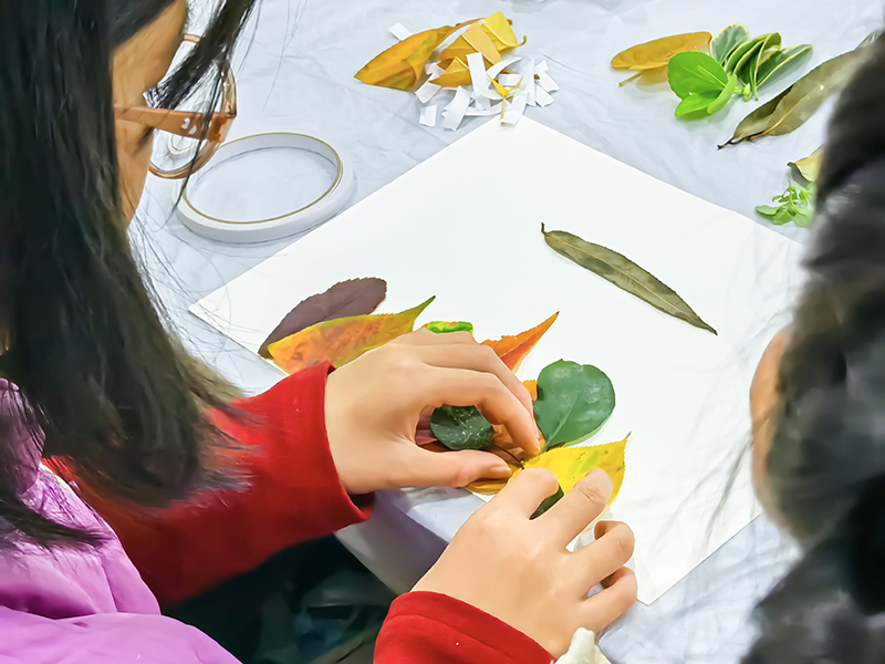 孩子们化身自然收藏家,将不同形状、颜色的树叶精心组合,想象力让平凡树叶变成生动画面。