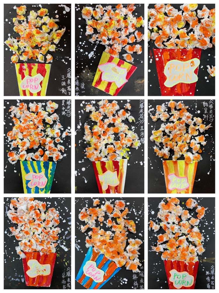 点评:《爆米花》孩子们都非常熟悉,作品中利用餐巾纸揉出爆米花的形状,涂上色彩,并且利用自己制作的贴纸当做爆米花杯子,是个不错的创意。每个学生都创作出了自己心目中爆米花的样子。