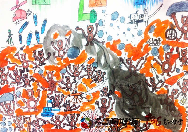 作品点评:这幅作品小画家刻画了大量的猴子,并用游戏的形式将它们分成两队进行PK,想法非常有创意,画面很有张力!能看得出这是一位想象丰富、创造力强、思维灵活的孩子。.jpg