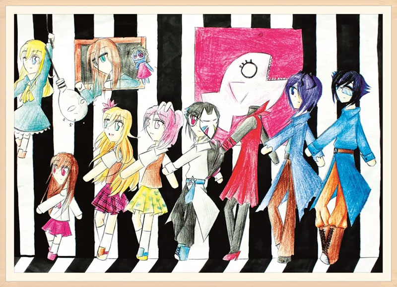 作品点评:整幅作品体现了孩子丰富的想象力,打破了固有的动漫人物形式,使画面具有故事性。从造型上,人物各具不同的头身比例,动作协调一致。表达了孩子丰富的情感,是一副耐人寻味的作品。