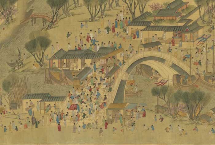 张择端的《清明上河图》描绘的是北宋的景色,仇英的《清明上河图》描绘的是明朝江南民众生活,男女老少、商人、农夫、艺人各种,人物动作、服饰都不雷同。仇英在临摹原本的基础上进行了二次创作,增加了场景,同时也对细小的场景作变动,做出了特色。