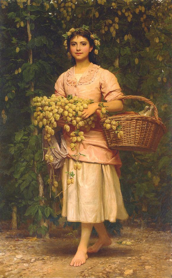 查尔斯·爱德华·佩鲁吉尼,是一名画家,主要作品有《采摘啤酒花》《在橘园》等。《采摘啤酒花》是查尔斯·爱德华·佩鲁吉尼所作的一幅油画。啤酒花是葎草,是被子植物门中的一个属,分布于北半球温带地区。其雌性的花朵通常被称为啤酒花,经常被用于啤酒酿造时的调味料和食品添加剂。佩鲁吉尼的这幅绘画作品,描述的是一个年轻姑娘在葎草种植园内采摘啤酒花。这种植物叶子有些像我国的桑叶,花朵或者也称为果实的很像国内的棉桃,品尝有苦感。