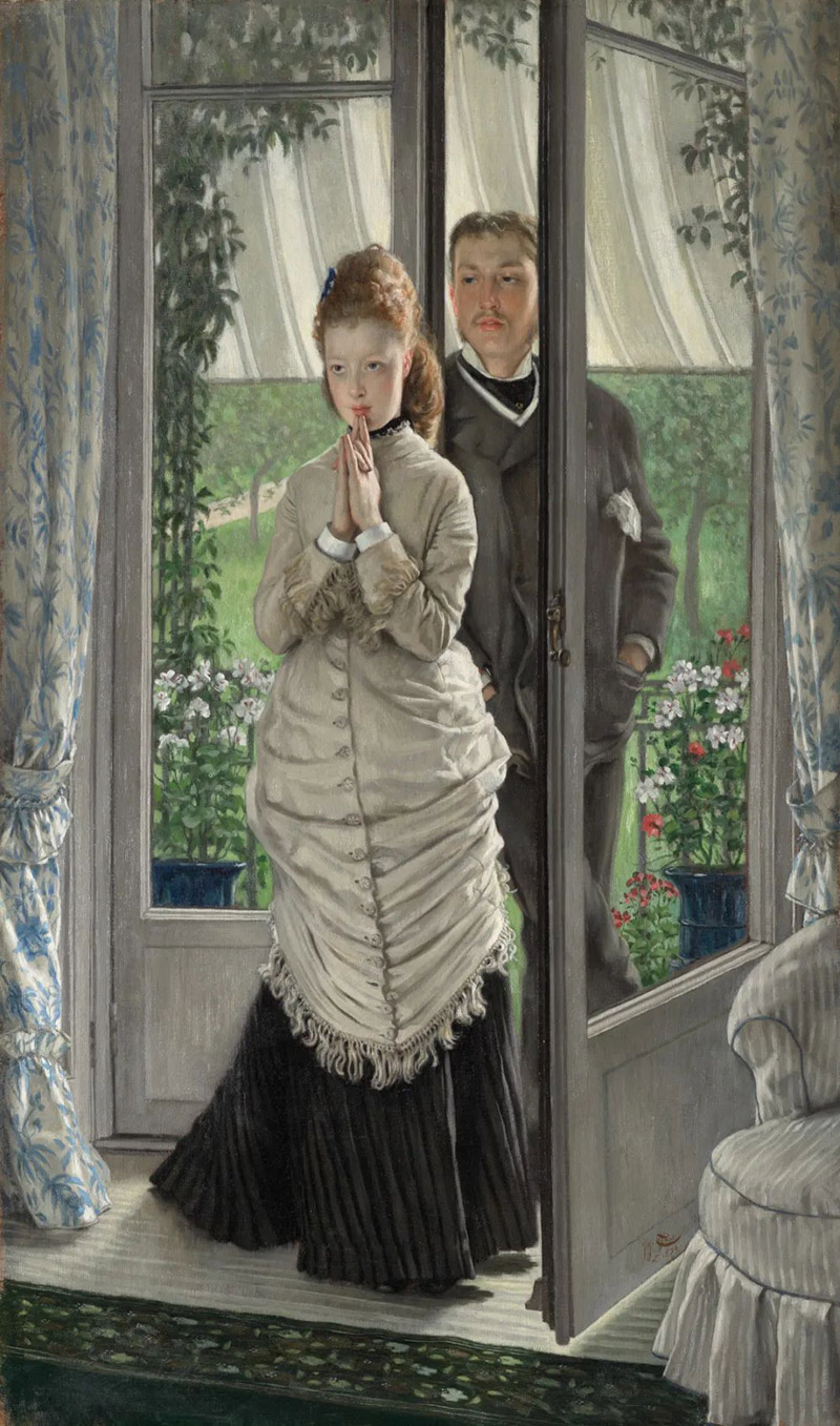 詹姆斯·蒂索(James Tissot,1836-1902)法国画家。原名是雅克·约瑟夫·蒂索(Jacques Joseph Tissot ),出生于港口城市南特,父亲是一位成功的布料商人,母亲帮着一起设计帽子,或许是父母从事的职业对他的影响,他对于布料的质感总有出色的描绘。17岁时,蒂索向父亲提出从事绘画事业的想法,招致反对,却得到母亲的支持。在那段时期,随着他对英语的兴趣,他开始以詹姆斯.蒂索(James Tissot)自称。1856年左右,蒂索前往巴黎接受专业的艺术教育,就读于法国美术学院。蒂索师从于画家让·希波利特·弗兰德林(Jean-Hippolyte Flandrin)和路易·拉莫特(Louis Lamothe),他们都是让·奥古斯特·多米尼克·安格尔(Jean-Auguste-Dominique Ingres)的学生,拉莫特也是弗兰德林的学生,指导蒂索的主要是拉莫特。