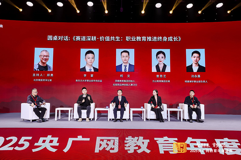 圆桌对话《赛道深耕·价值共生:职业教育推进终身成长》北京晚报资深记者郑勇先生对话新东方大学事业部市场总监李蒙先生,研鹿教育集团创始人、后保研品牌创始人兼CEO柯文先生,为公教育集团总裁曾思艺女士,明德博学事业部负责人孙永喜先生。