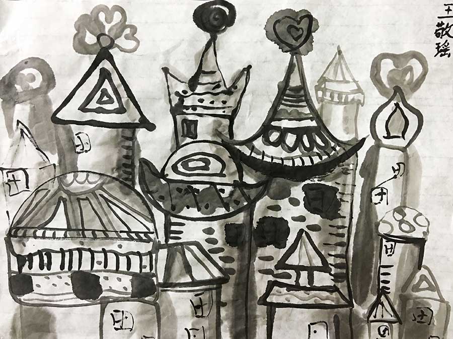 通过学习,学生们了解了城堡的外形结构特征与建筑风格,增加了学生对其相关知识的了解。让学生初步了解了墨分五色:焦、浓、重、淡、清,能够尝试利用不同的墨色变化结合勾染法,创作自己心目中的梦幻城堡。同时学生们通过使用新的绘画工具与绘画形式的学习,提高了学生的绘画兴趣,增加了绘画学习的积极性。