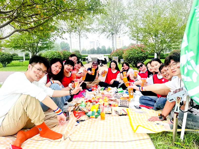 草坪上我们围坐成圈,美食与笑声在秋风中飘荡,此刻时光格外温馨。