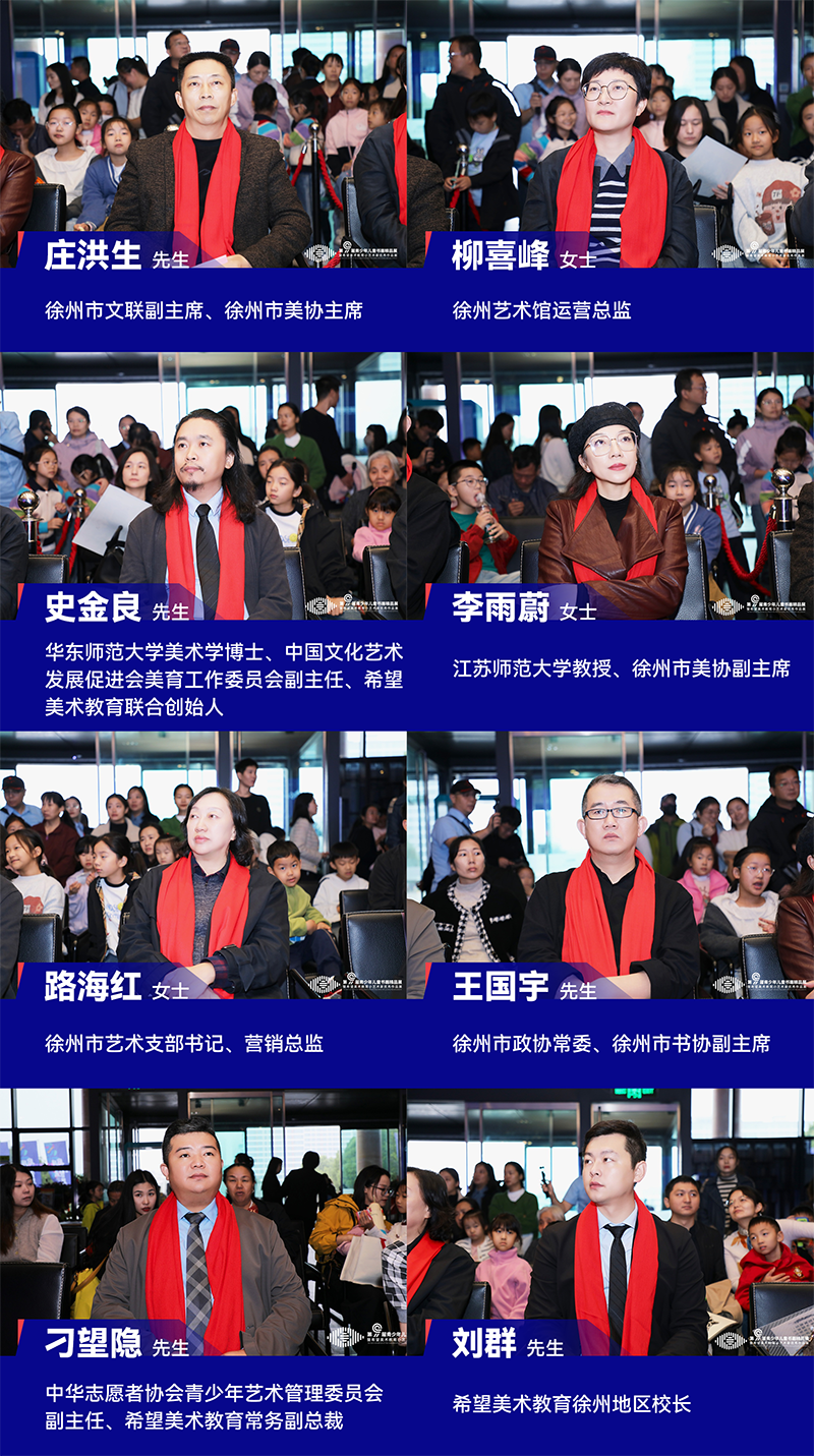 徐州市文联副主席、徐州市美协主席庄洪生先生,徐州艺术馆运营总监柳喜峰女士,华东师范大学美术学博士、中国文化艺术发展促进会美育工作委员会副主任、希望美术教育联合创始人史金良先生,江苏师范大学教授、徐州市美协副主席李雨蔚女士,徐州市艺术支部书记、营销总监路海红女士,徐州市政协常委、徐州市书协副主席王国宇先生,中华志愿者协会青少年艺术管理委员会副主任、希望美术教育常务副总裁刁望隐先生,希望美术教育徐州地区校长刘群先生出席了开幕式。